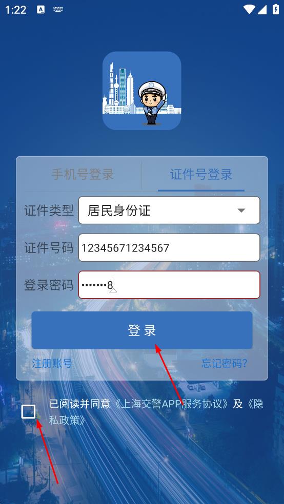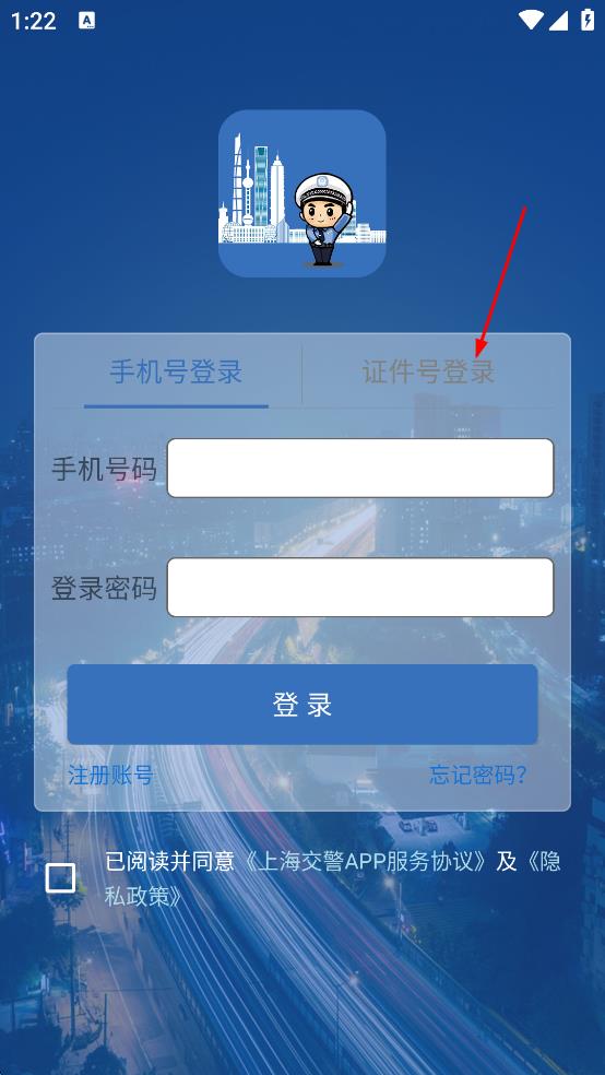 4、勾選已閱讀并同意上海交警APP服務協(xié)議及隱私政策,最后點擊“登錄”按鈕,完成登錄操作。