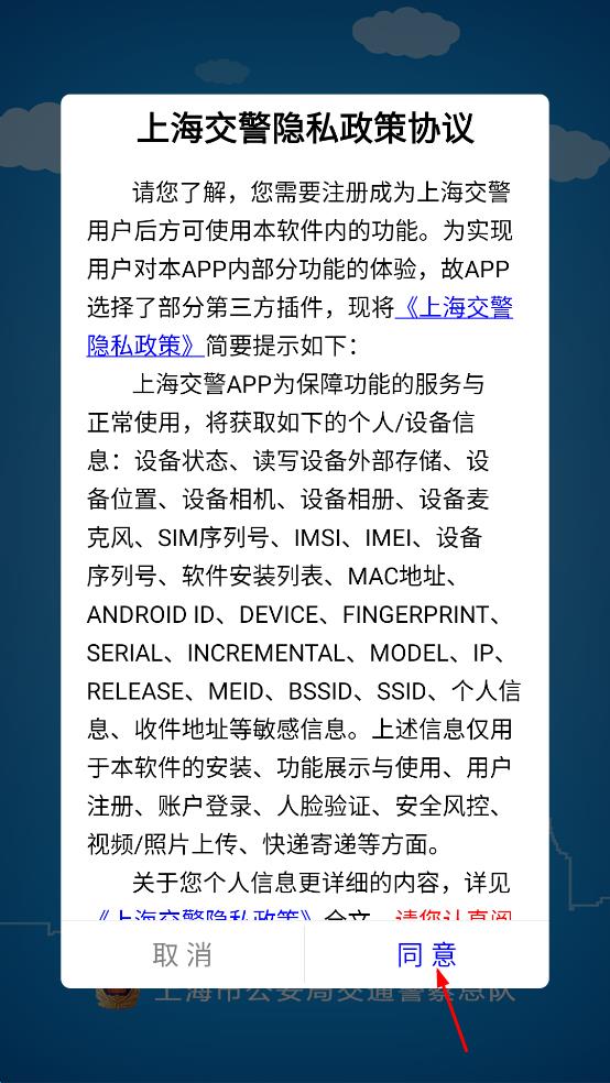 1、打開上海交警APP,會彈出上海交警隱私政策協(xié)議頁面,仔細查看內容后,點擊“同意”按鈕,進入登錄界面。