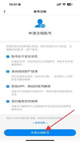 3、在賬號(hào)注銷頁(yè)面后,仔細(xì)閱讀申請(qǐng)注銷賬號(hào)的提示,確認(rèn)無誤后點(diǎn)擊底部申請(qǐng)注銷賬號(hào)按鈕。
