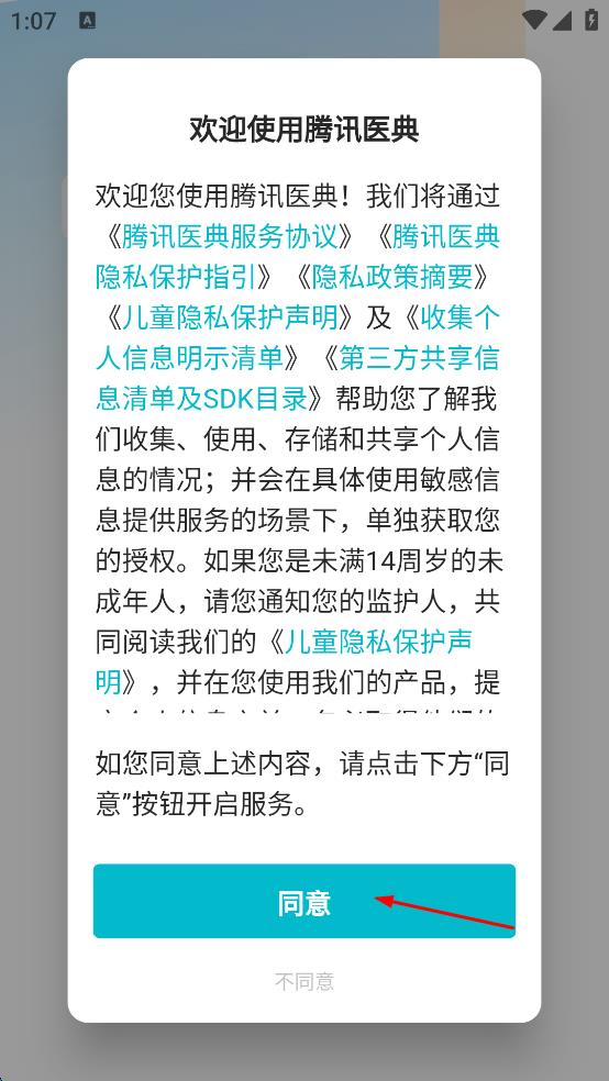 1、打開騰訊醫(yī)典,在彈出的服務協(xié)議等提示頁面,點擊同意,進入騰訊醫(yī)典首頁。