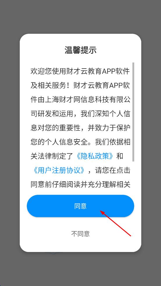 1、打開財才云教育APP,出現(xiàn)溫馨提示頁面,仔細查看后點擊“同意”按鈕。