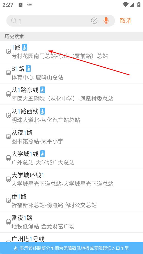 3、在公交查詢頁(yè)面的搜索框中輸入要查詢的公交線路,或者在歷史搜索列表中點(diǎn)擊對(duì)應(yīng)的公交線路,如“1路”。