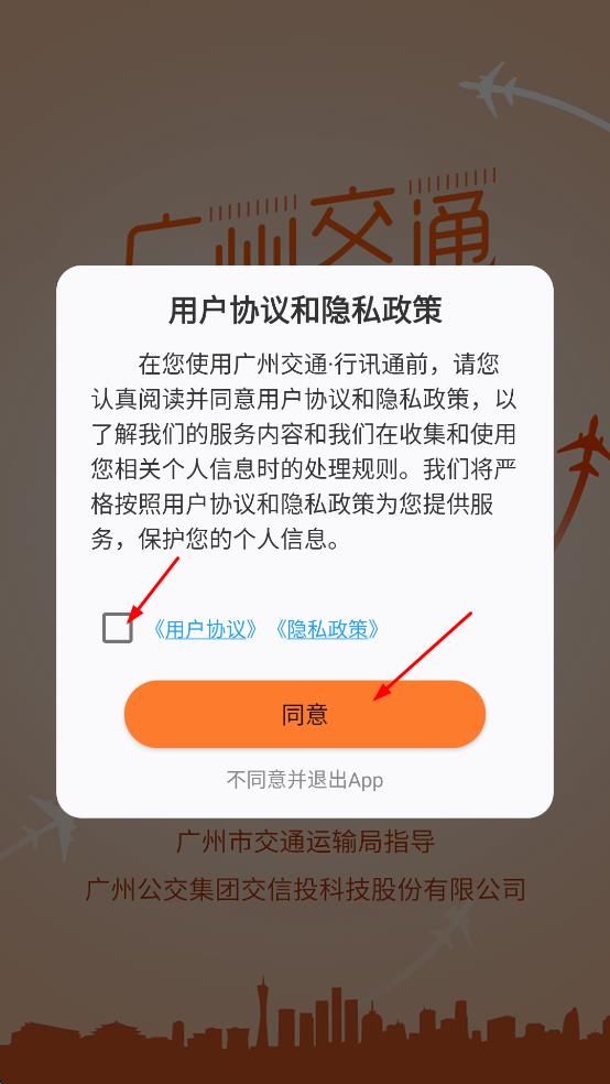 1、打開(kāi)廣州行訊通APP,在彈出的用戶協(xié)議和隱私政策提示框中,勾選相關(guān)協(xié)議,然后點(diǎn)擊同意按鈕。