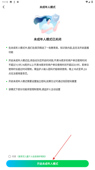 5、了解該模式后,點(diǎn)擊開啟未成年人模式即可成功。
