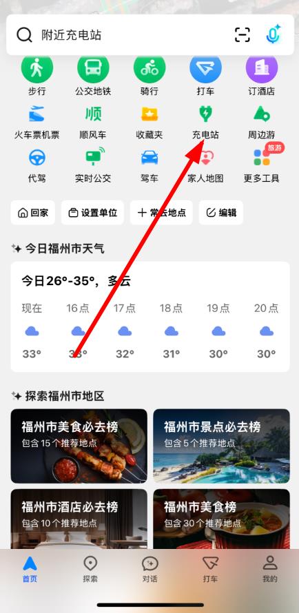 2、在首頁的功能欄中,找到并點擊充電站選項,進入充電站頁面。