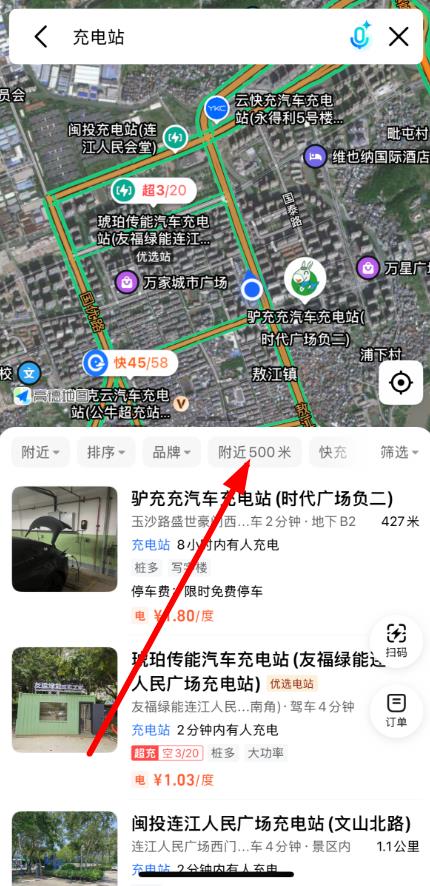 3、在充電站頁面中,地圖會顯示附近的充電樁位置,還能通過點擊附近選項,設(shè)置搜索范圍,篩選查看特定范圍內(nèi)的充電樁。