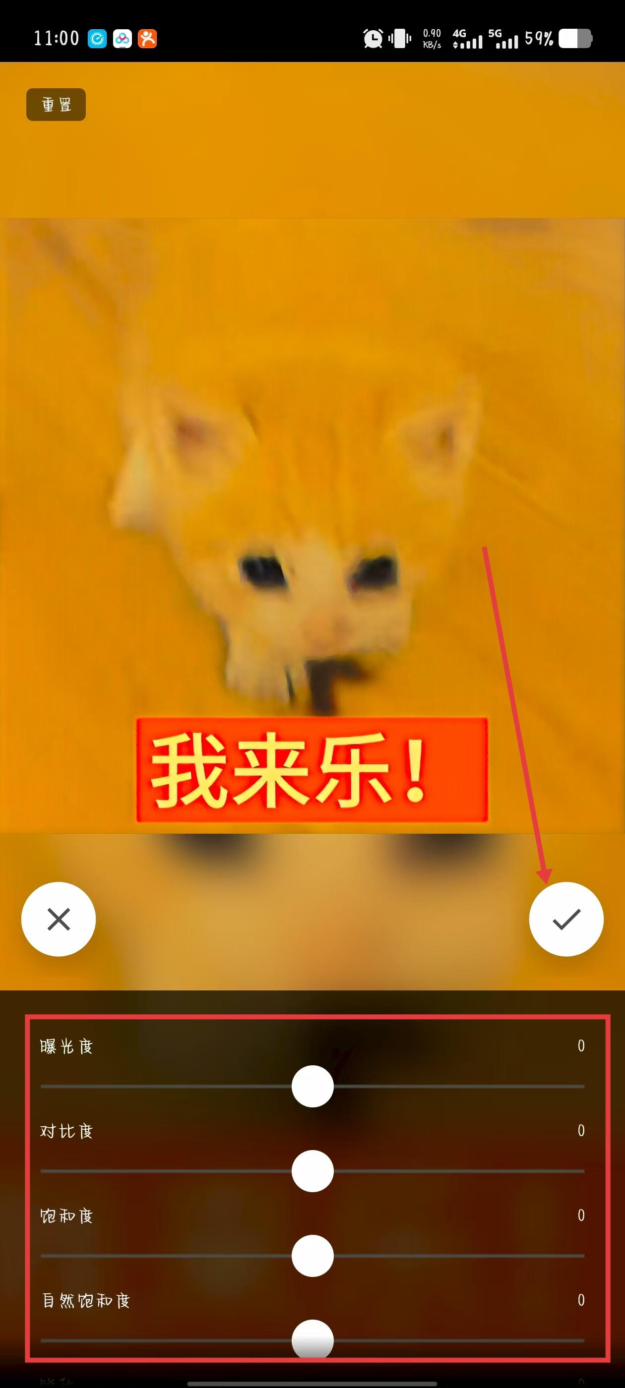 3、拖動參數(shù)調(diào)整條,對照片的曝光度、對比度等進行調(diào)整,調(diào)整滿意后點擊確認(rèn)圖標(biāo)。