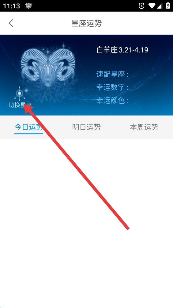 3、在星座運(yùn)勢詳情頁面,點(diǎn)擊切換星座按鈕,進(jìn)入選擇星座的界面。