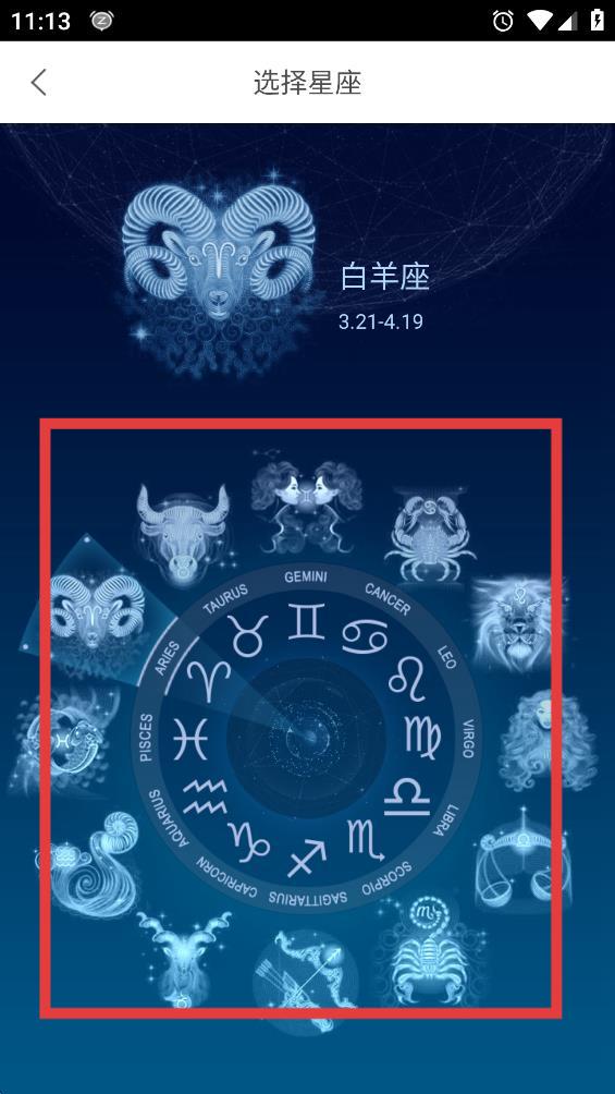 4、在選擇星座的界面中,點(diǎn)擊想要查看運(yùn)勢的星座圖標(biāo),即可查看該星座運(yùn)勢信息。