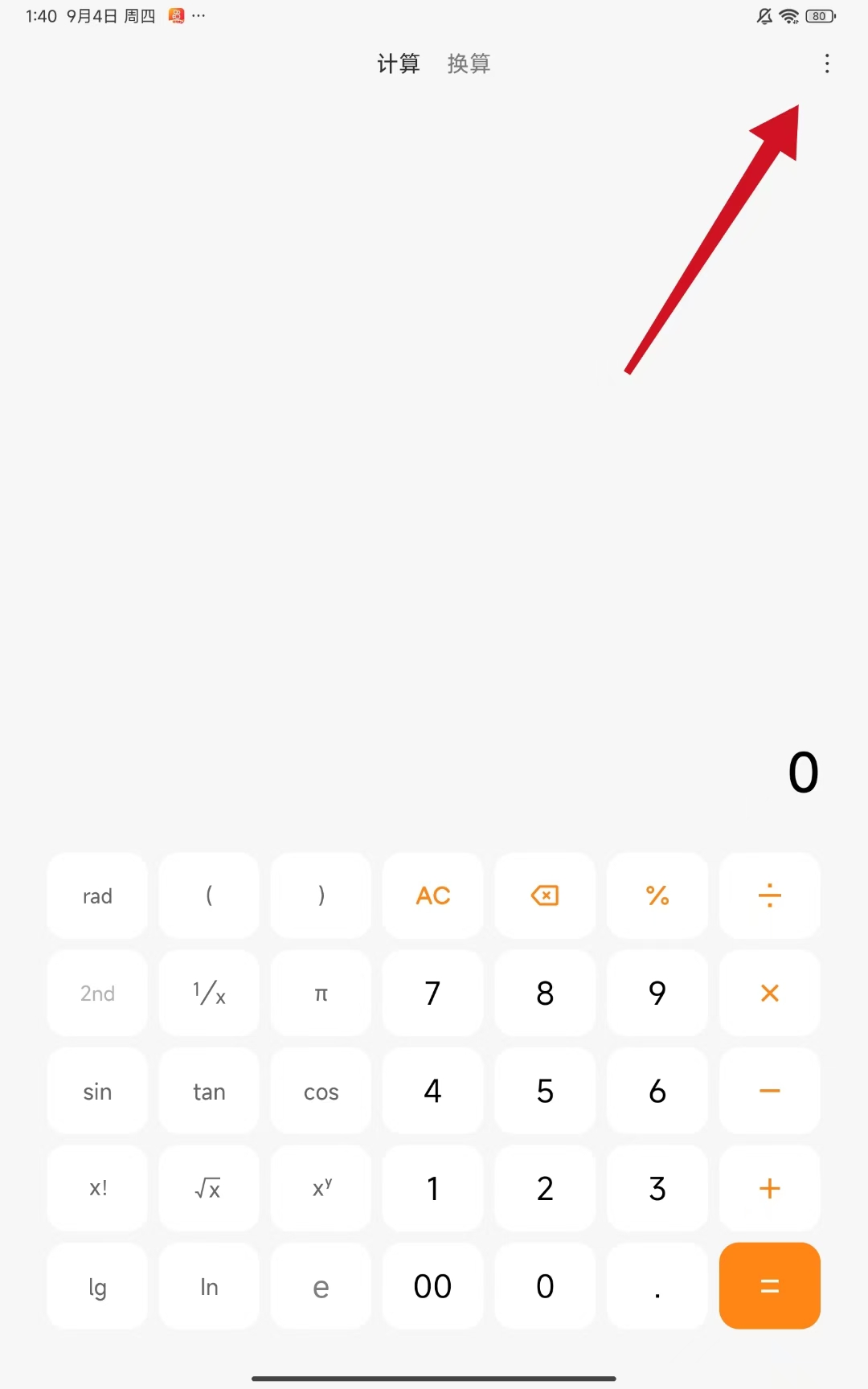 1、打開小米手機(jī)中的計(jì)算器應(yīng)用,點(diǎn)擊界面右上角的三點(diǎn)圖標(biāo),打開更多選項(xiàng)。