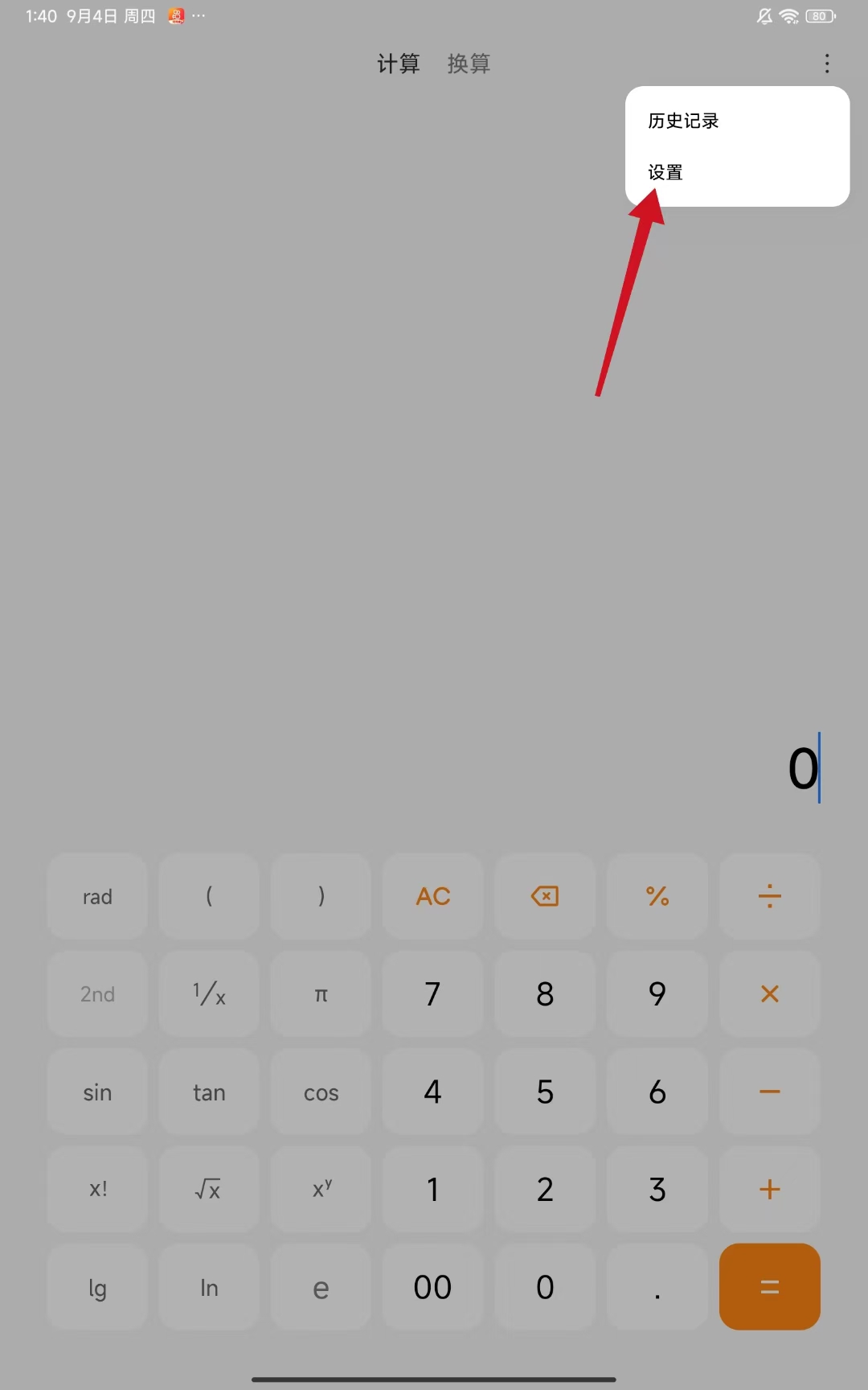 2、在彈出的下拉菜單中,點(diǎn)擊設(shè)置選項(xiàng),進(jìn)入計(jì)算器的設(shè)置頁(yè)面。