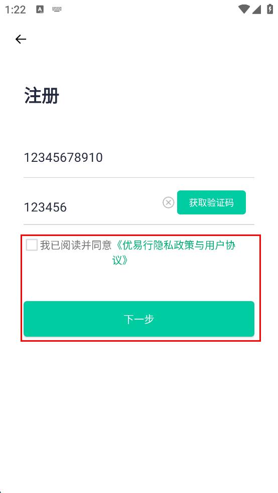 4、勾選“我已閱讀并同意優(yōu)易行隱私政策與用戶協(xié)議,然后點(diǎn)擊“下一步”按鈕,進(jìn)行后續(xù)注冊流程。