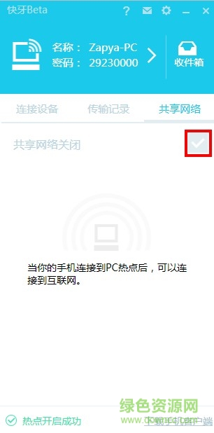 啟動“快牙電腦版”后,如果電腦已連接互聯(lián)網(wǎng),則“快牙電腦版”將自動分享WiFi信號,供其他設(shè)備連接上網(wǎng),此功能也可手動關(guān)閉網(wǎng)絡(luò)共享。