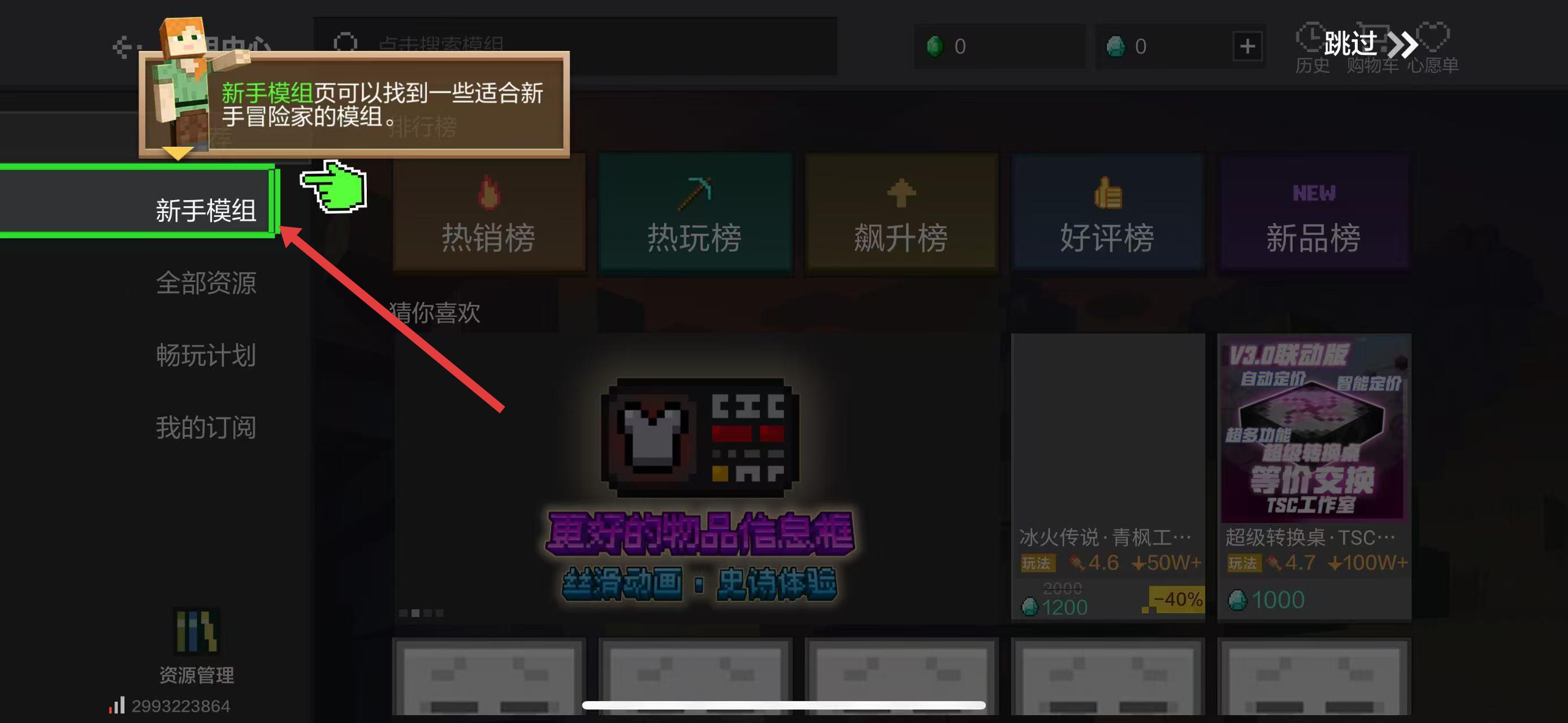3、進入新手模組界面,瀏覽“萌新必備模組”列表,像清爽像素等模組,點擊模組封面可看介紹,按需下載體驗新內容。