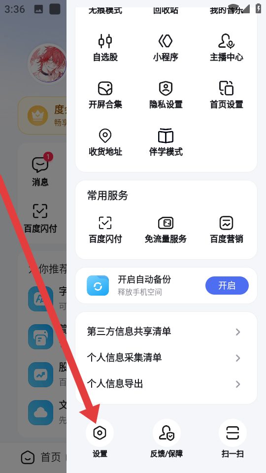 1、打開百度APP,在側(cè)邊的功能欄中找到并點擊設(shè)置的選項,進入設(shè)置的界面。