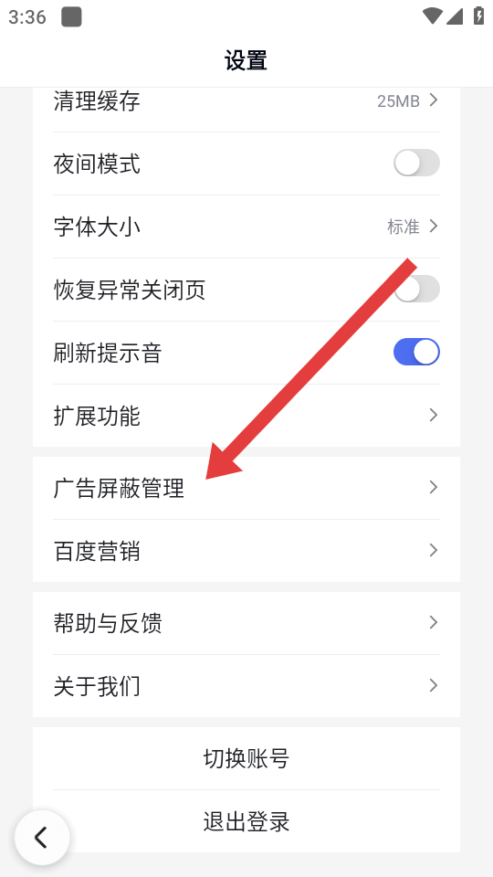2、在設(shè)置的界面中,找到廣告屏蔽管理選項并點擊,進入廣告屏蔽管理的頁面。