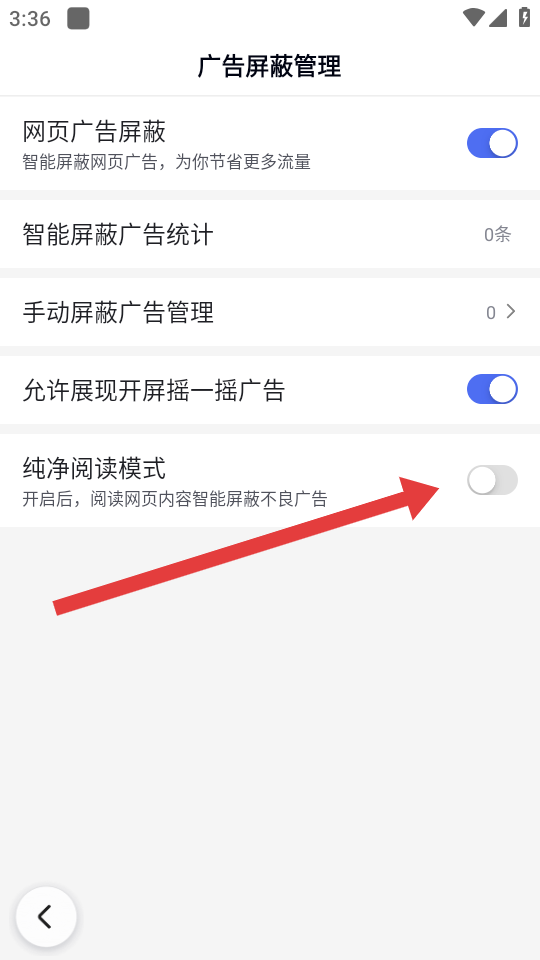3、在廣告屏蔽管理的頁面,找到純凈閱讀模式,開關(guān)若為開啟狀態(tài)點擊該開關(guān)將其關(guān)閉,即可關(guān)閉純凈閱讀模式。