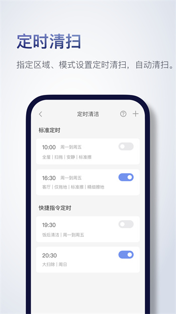 預(yù)約定時(shí)清掃任務(wù),機(jī)器人將在指定開始清掃任務(wù),完成后將自動返回充電座。