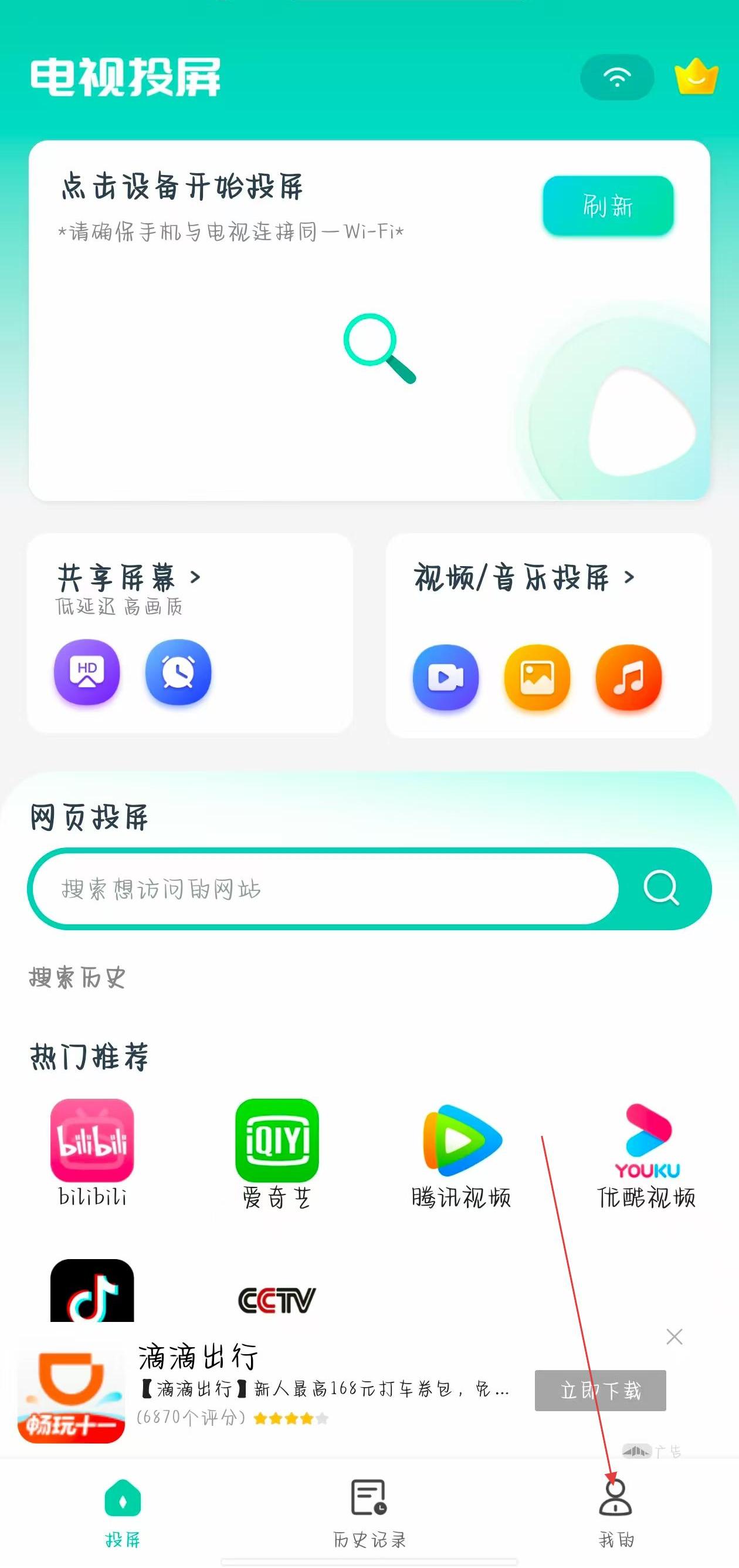 1、打開(kāi)TV電視投屏應(yīng)用,點(diǎn)擊界面右下角的我的選項(xiàng),進(jìn)入個(gè)人中心頁(yè)面。