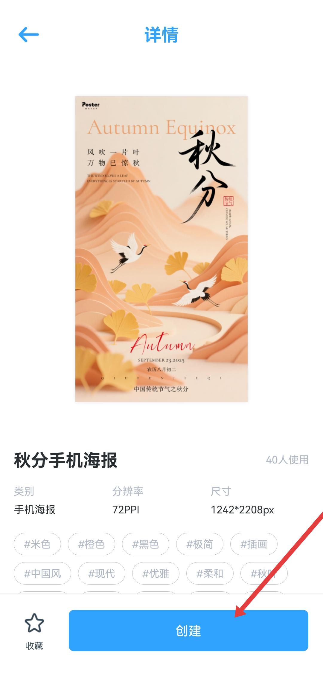 2、在海報(bào)詳情頁(yè)面,點(diǎn)擊底部創(chuàng)建按鈕,進(jìn)入海報(bào)編輯界面。