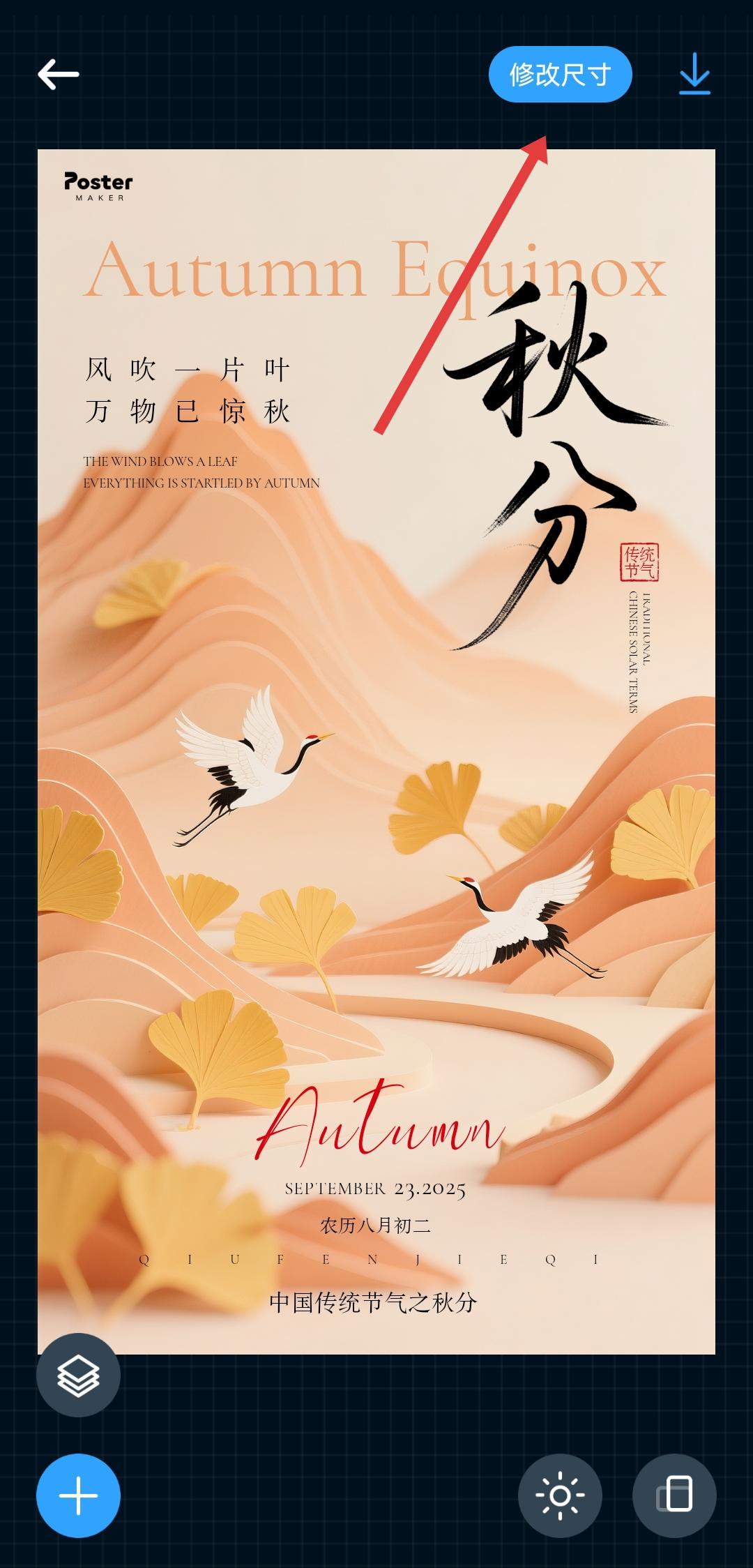 3、在海報(bào)編輯界面右上角,點(diǎn)擊修改尺寸按鈕,進(jìn)入修改尺寸頁(yè)面。