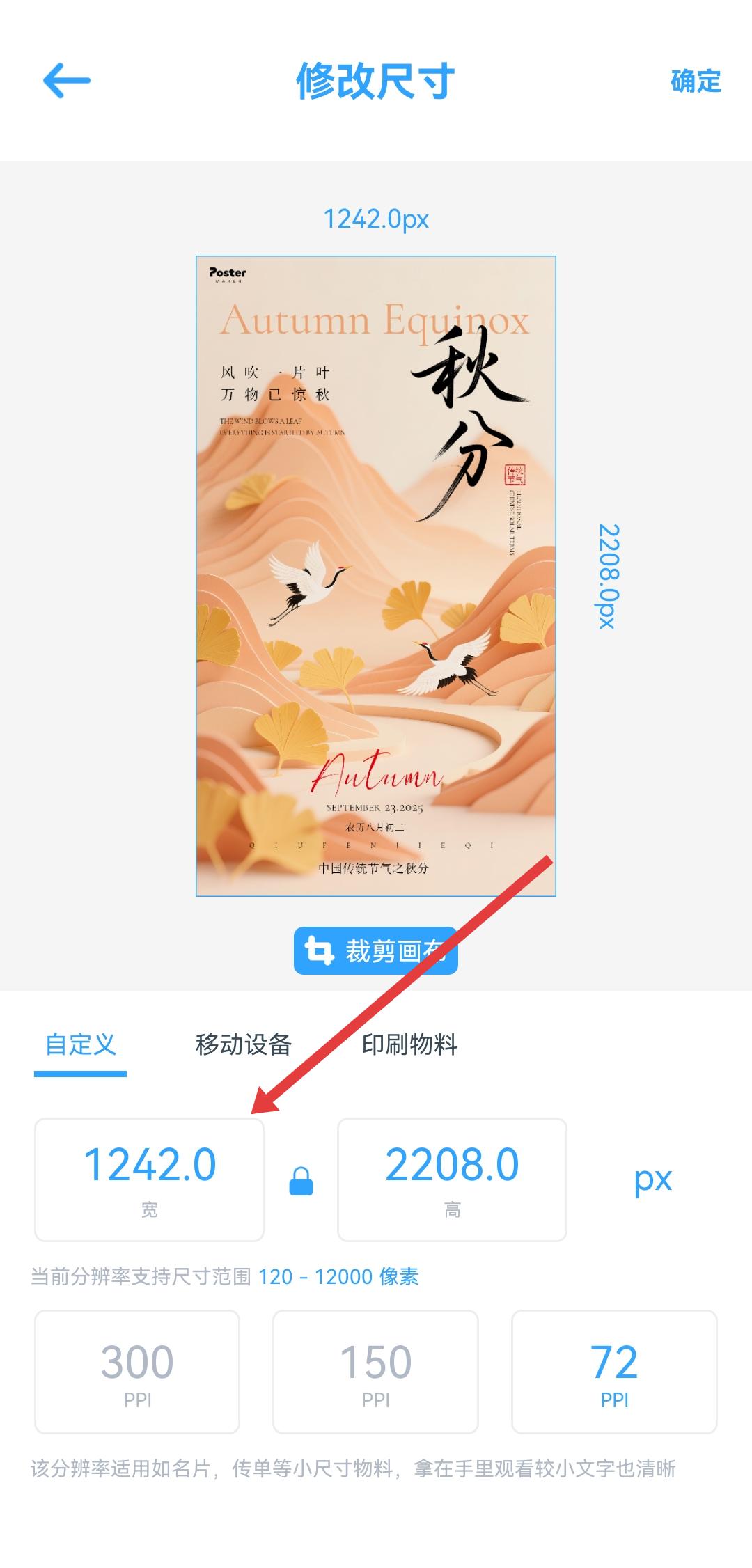 4、在頁(yè)面調(diào)整寬、高的數(shù)值,設(shè)置完成后點(diǎn)擊確定,完成海報(bào)尺寸修改。