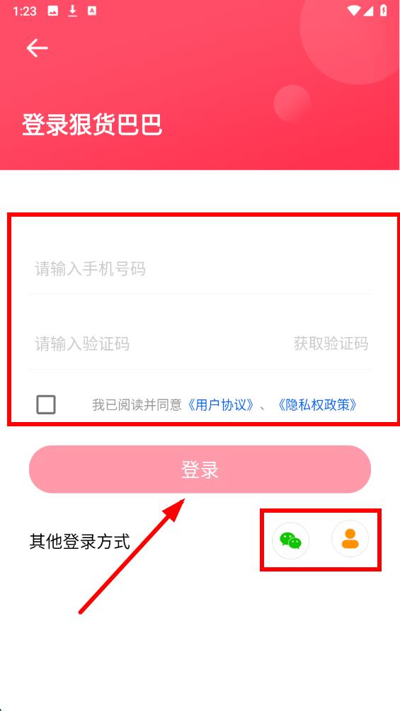 3、進(jìn)入登錄界面后,在對(duì)應(yīng)輸入框內(nèi)填寫(xiě)手機(jī)號(hào)碼和驗(yàn)證碼后勾選同意用戶(hù)協(xié)議,點(diǎn)擊登錄按鈕即可完成注冊(cè)登錄操作,還可以使用第三方直接注冊(cè)登錄。