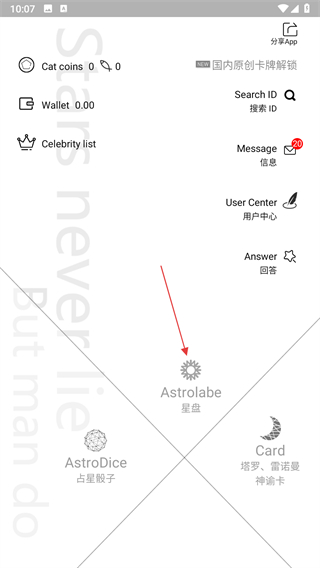 1、打開占星貓應(yīng)用,在主界面中點(diǎn)擊星盤選項(xiàng),進(jìn)入星盤相關(guān)操作頁(yè)面。