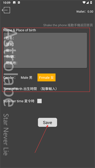 3、在資料填寫界面,依次輸入信息,選擇性別,并輸入出生時(shí)間,填寫完成后點(diǎn)擊Save按鈕。