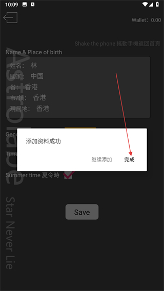 4、點(diǎn)擊Save后,點(diǎn)擊完成,即可成功添加個(gè)人資料用于后續(xù)占星相關(guān)操作。