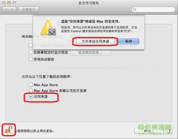 4、在通用--允許從以下位置下載的應(yīng)用程序--選擇 任何來(lái)源(更改前如果是灰色無(wú)法選擇需要點(diǎn)擊左下角的鎖頭標(biāo)志輸入密碼解鎖后才可以更改)