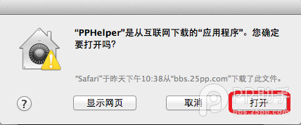 5、更改之后在打開(kāi)PP助手,出現(xiàn)“PPHelper”是從互聯(lián)網(wǎng)下載的“應(yīng)用程序”。您確定要打開(kāi)嗎? 的提示后,點(diǎn)擊打開(kāi)。