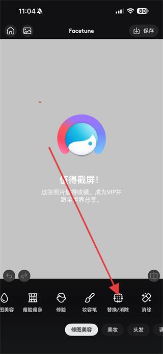 3、進(jìn)入編輯界面后,點(diǎn)擊下方工具欄中的替換/消除工具,準(zhǔn)備進(jìn)行去除人物操作。