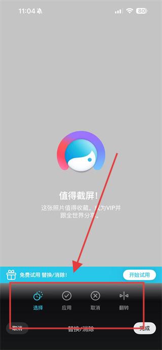 4、在彈出的替換/消除操作選項(xiàng)中,使用選擇功能圈選需要p掉的人物,接著點(diǎn)擊應(yīng)用,即可嘗試將人物從圖片中去除,完成后點(diǎn)擊完成相關(guān)操作。