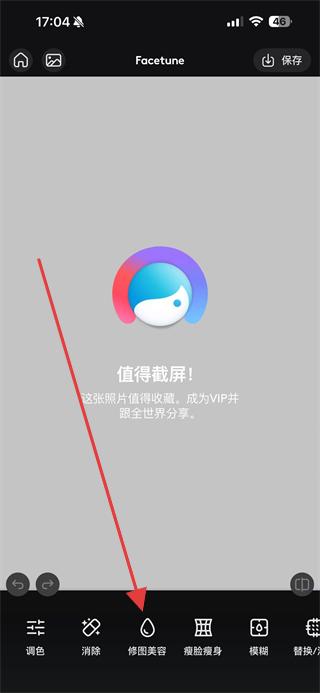 4、在修圖美容功能選擇界面,可選擇功能對(duì)照片進(jìn)行美化,再點(diǎn)擊右上角的保存按鈕,保存修圖后的照片。