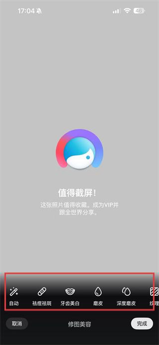 3、照片導(dǎo)入后,點(diǎn)擊底部的修圖美容按鈕,進(jìn)入修圖美容功能選擇界面。
