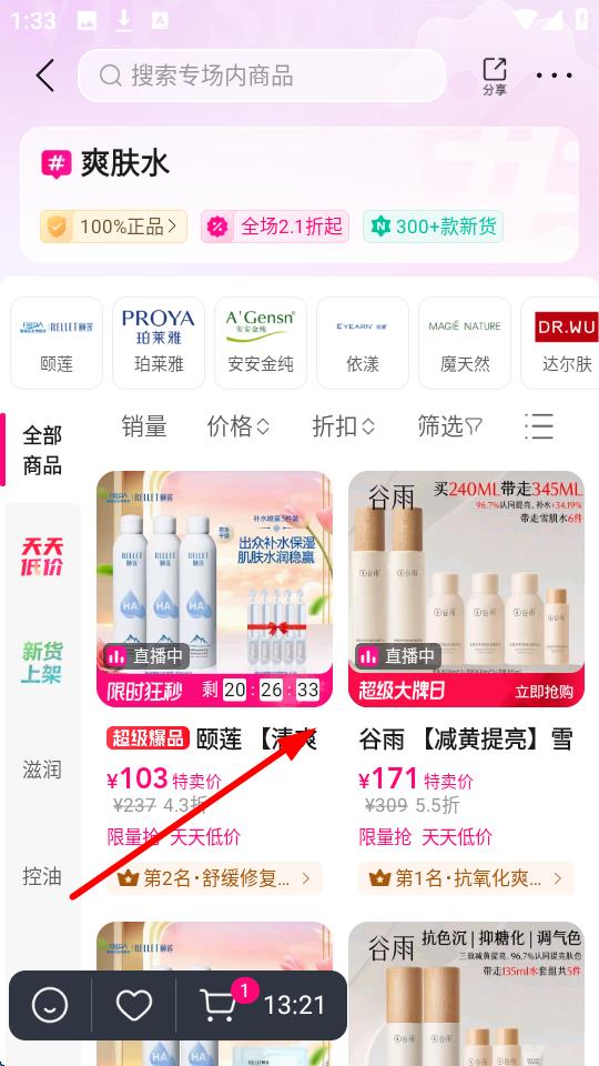 1、打開唯品會APP,進入【爽膚水】專場,在搜索框下方能看到“100%正品”“全場2.1折起”等標(biāo)識。通過【全部商品】下方的【銷量】【價格】【折扣】等篩選條件,快速定位目標(biāo)商品,若商品處于【直播中】,留意【限時狂秒】倒計時,找到心儀商品后點擊進入。