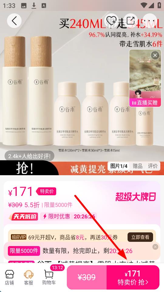 2、進入商品詳情頁,查看【谷雨】爽膚水的優(yōu)惠力度,如【特賣價-¥171】,相比原價【¥309】打5.5折,且【限量5000件】,還有“買240ML帶走345ML”等優(yōu)惠。同時關(guān)注【2.4k+人給出好評】等用戶反饋,確認商品符合需求。