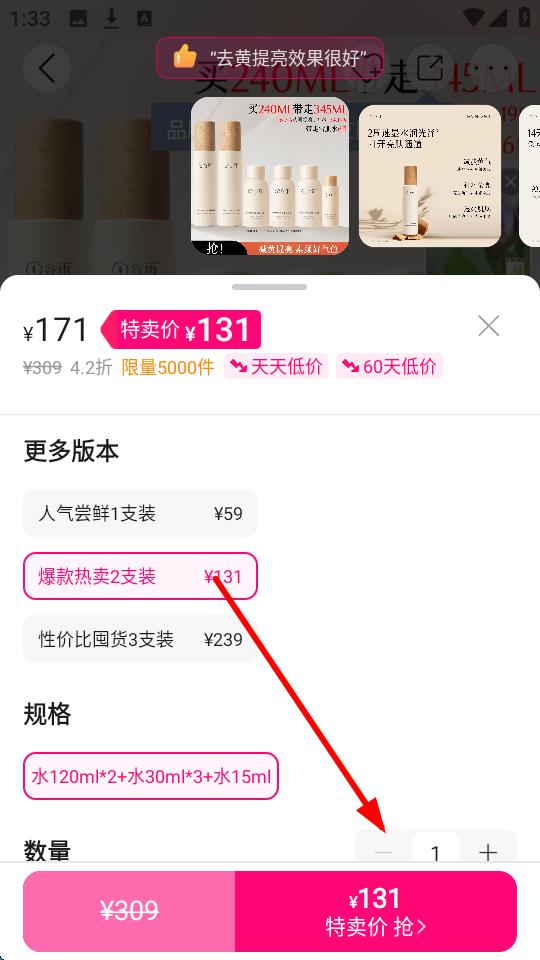 3、在商品詳情頁下方【更多版本】處,選擇如【爆款熱賣2支裝】等合適套裝,確認【規(guī)格】(如水120ml*2+水30ml*3+水15ml)無誤后,點擊“+”“-”調(diào)整【數(shù)量】,再點擊【特賣價-搶】,即可將商品添加至購物車。