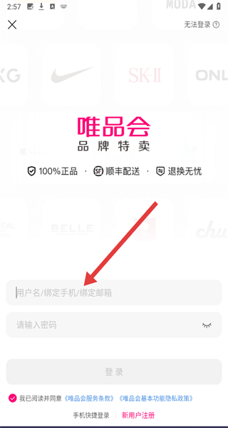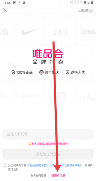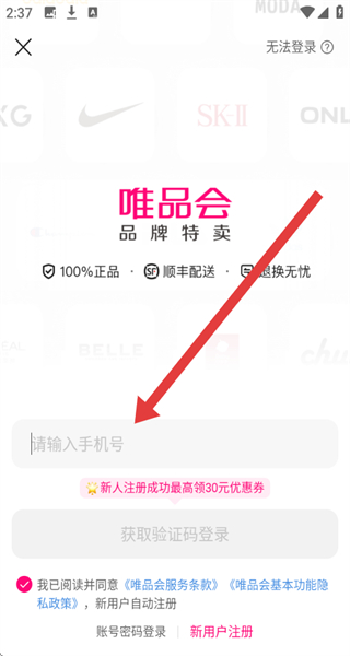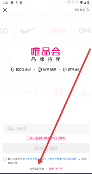 首先下載唯品會手機APP,安裝完畢后,點擊安裝好的唯品會手機APP,會出現(xiàn)注冊登陸頁面,申請好賬戶,然后登陸唯品會手機APP。