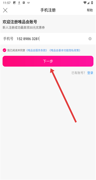 3、跳轉(zhuǎn)到手機注冊頁面中,點擊輸入框填寫好手機號后,勾選同意按鈕并點擊下一步。