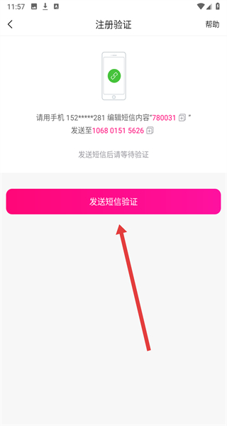 4、進入到注冊驗證頁面時,點擊發(fā)送短信驗證按鈕,進行驗證操作后完成注冊。