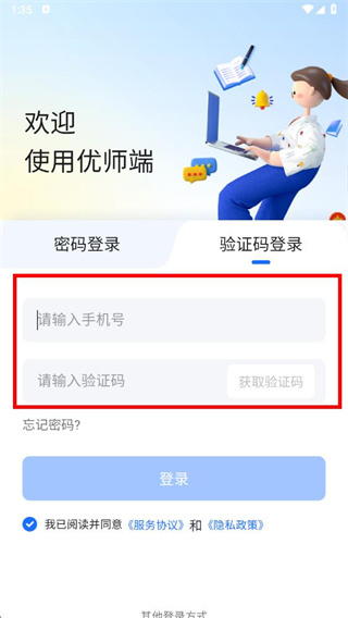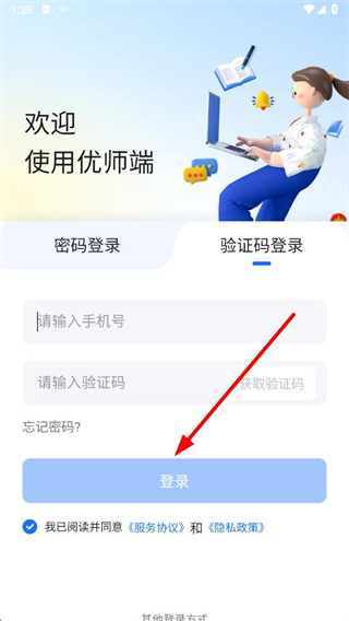 3、確保勾選同意服務(wù)協(xié)議和隱私政策,點(diǎn)擊登錄,即可完成優(yōu)師端的驗(yàn)證碼登錄操作。