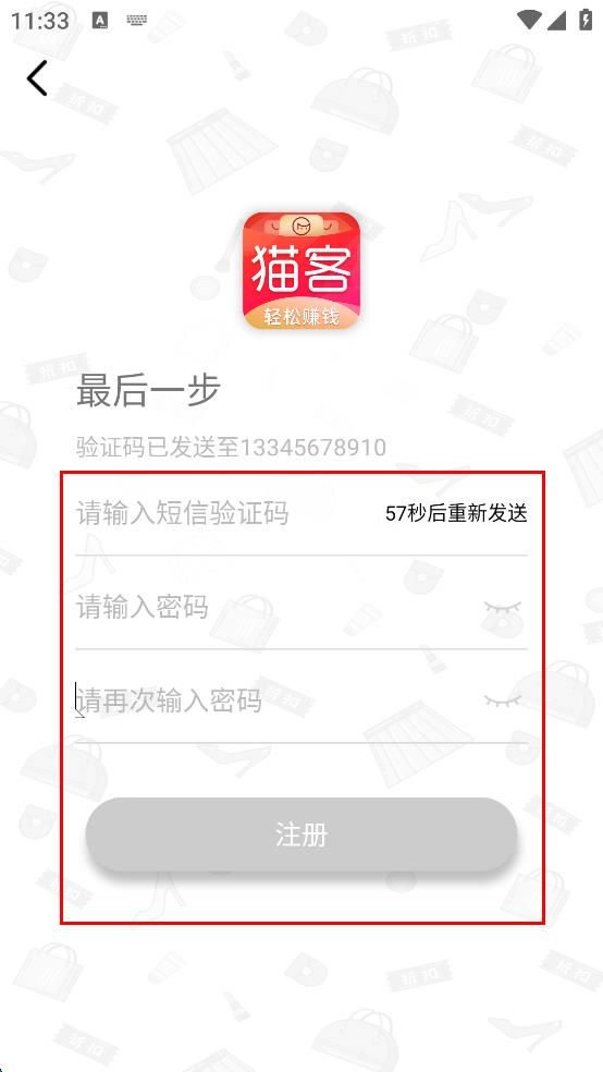 4、進(jìn)入最后一步頁(yè)面,輸入短信驗(yàn)證碼、密碼并再次輸入密碼,然后點(diǎn)擊“注冊(cè)”按鈕。