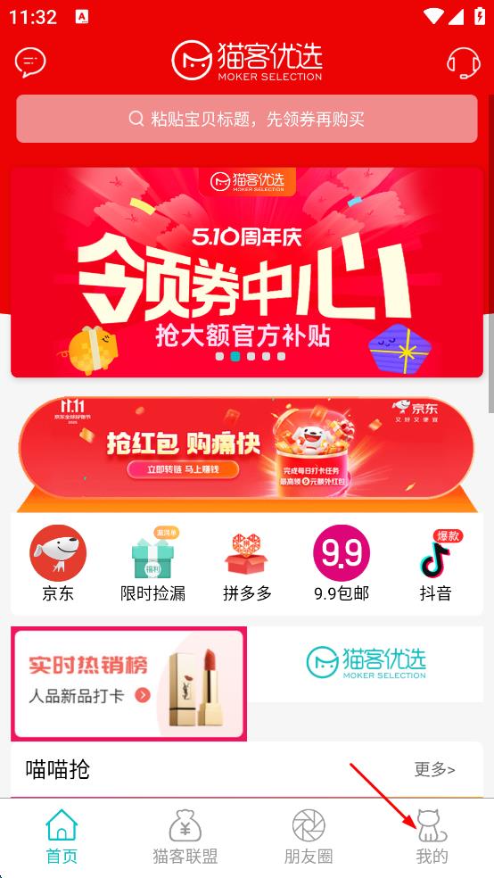 1、打開貓客優(yōu)選APP,進(jìn)入首頁(yè)后,點(diǎn)擊頁(yè)面右下角的“我的”按鈕。
