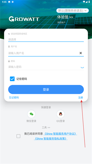 1、啟動(dòng)古瑞瓦特app,進(jìn)入時(shí)點(diǎn)擊右側(cè)注冊(cè)的功能按鈕。