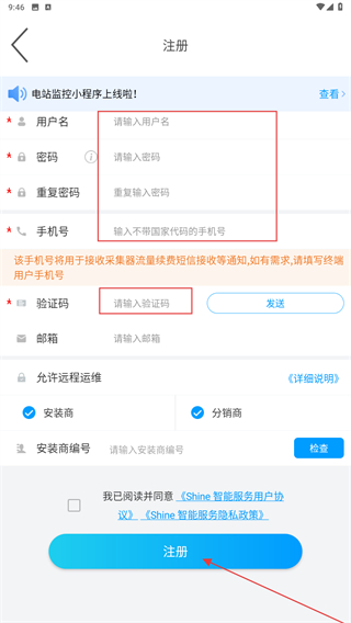 4、輸入用戶名、密碼、手機(jī)號(hào)以及驗(yàn)證碼,再點(diǎn)擊注冊(cè)即可。