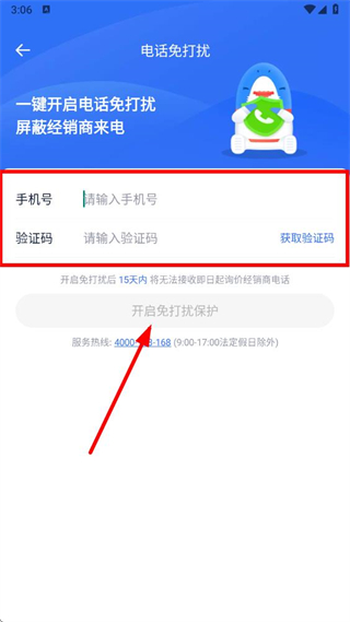 4、在電話免打擾頁面,填寫手機號,獲取并輸入驗證碼后,點擊開啟免打擾保護,即可開啟該功能。