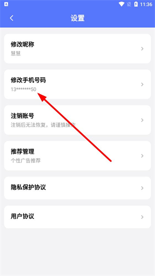 3、在設(shè)置界面,選擇修改手機(jī)號(hào)碼選項(xiàng),進(jìn)入手機(jī)號(hào)變更頁(yè)面。