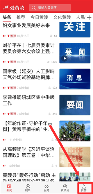 1、在愛黃陵APP首頁,點擊底部我的按鈕,進入個人的頁面。